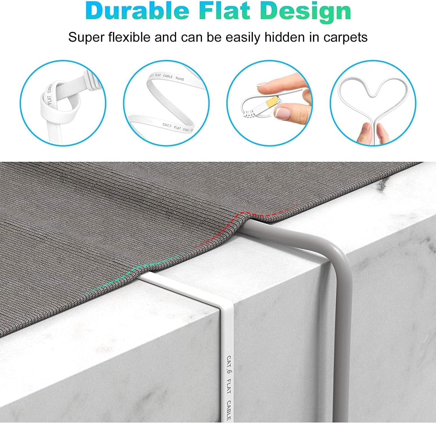 - 【HIGH NEATNESS】The flat design of Cat 6e ethernet cable helps to avoid tangling and save space. When designing home decoration and wall wiring, the white appearance and high-soft cable jacket are very durable and can be reasonably wired