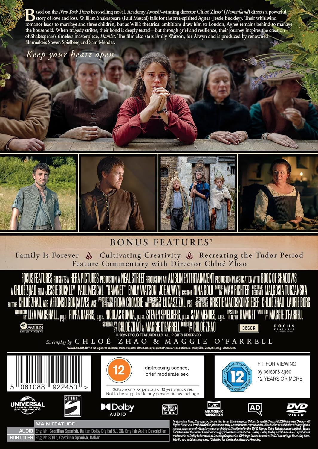 Based on the New York Times best-selling novel, Academy Award®-winning director Chloé Zhao (Nomadland) directs a powerful story of love and loss. William Shakespeare (Paul Mescal) falls for the free-spirited Agnes (Jessie Buckley). Their whirlwind romance leads to marriage and three children, but as Will's theatrical ambitions draw him to London, Agnes remains behind to manage the household. When tragedy strikes, their bond is deeply tested—but through grief and resilience, their journey inspires the creation of Shakespeare's timeless masterpiece, Hamlet. The film also stars Emily Watson, Joe Alwyn and is produced by renowned filmmakers Steven Spielberg and Sam Mendes.
